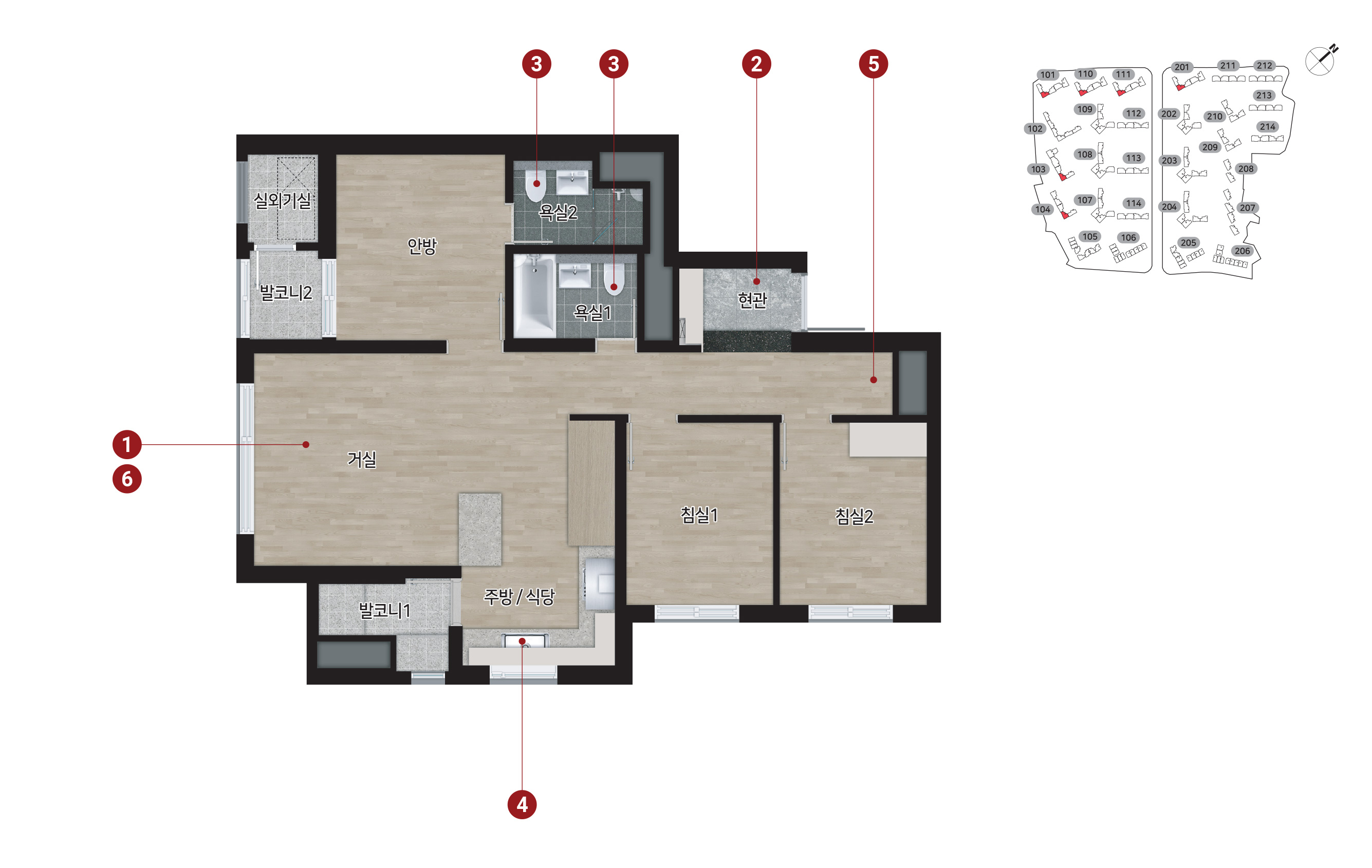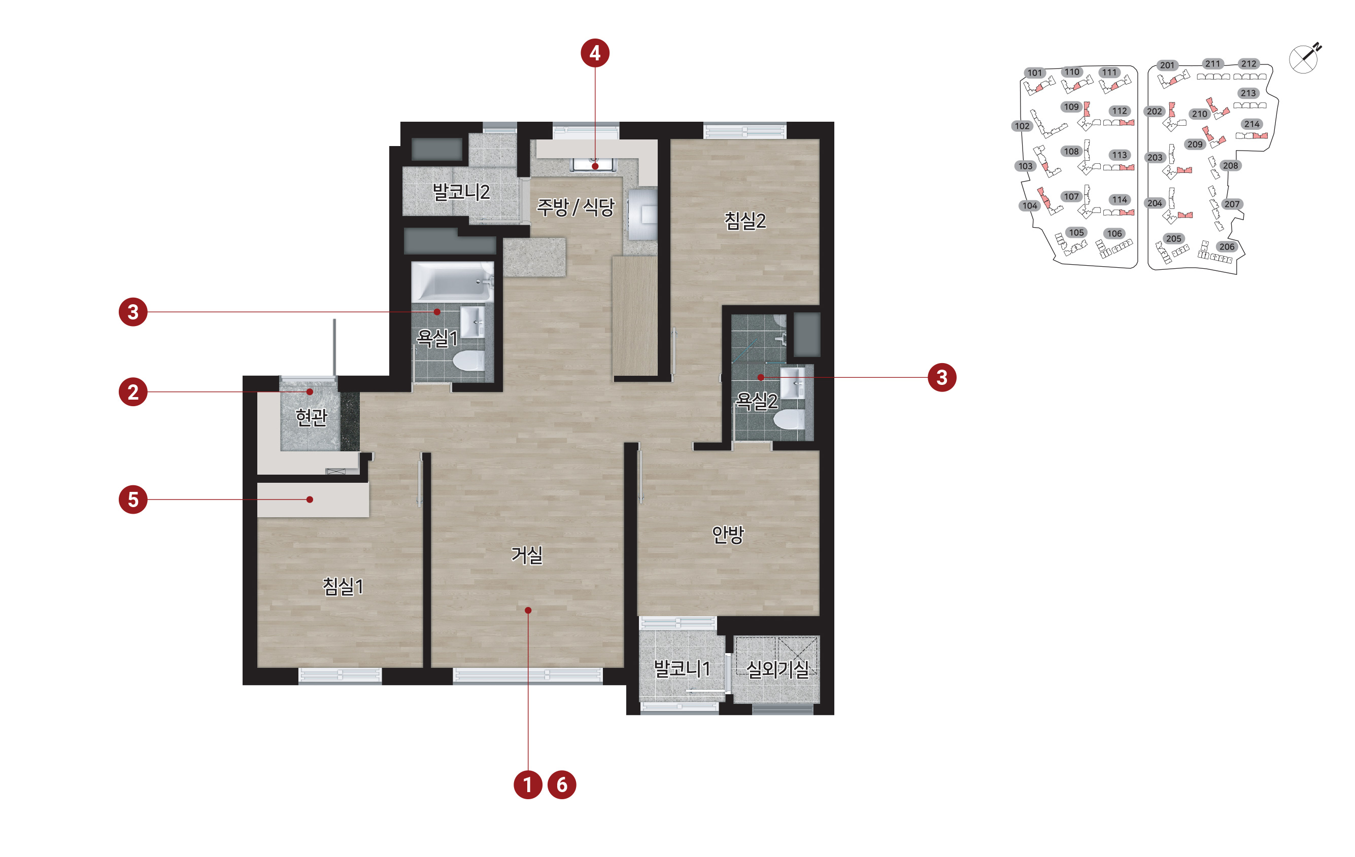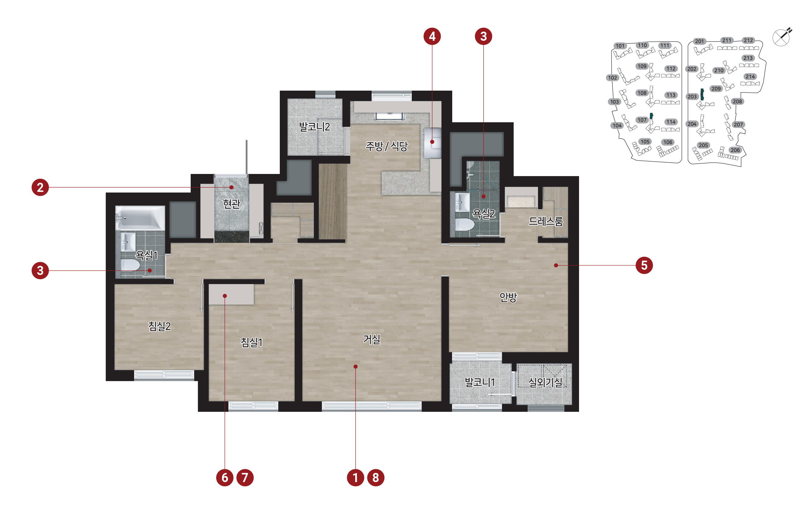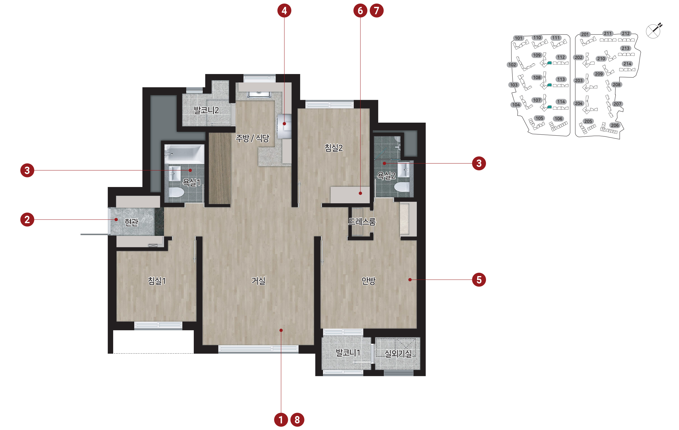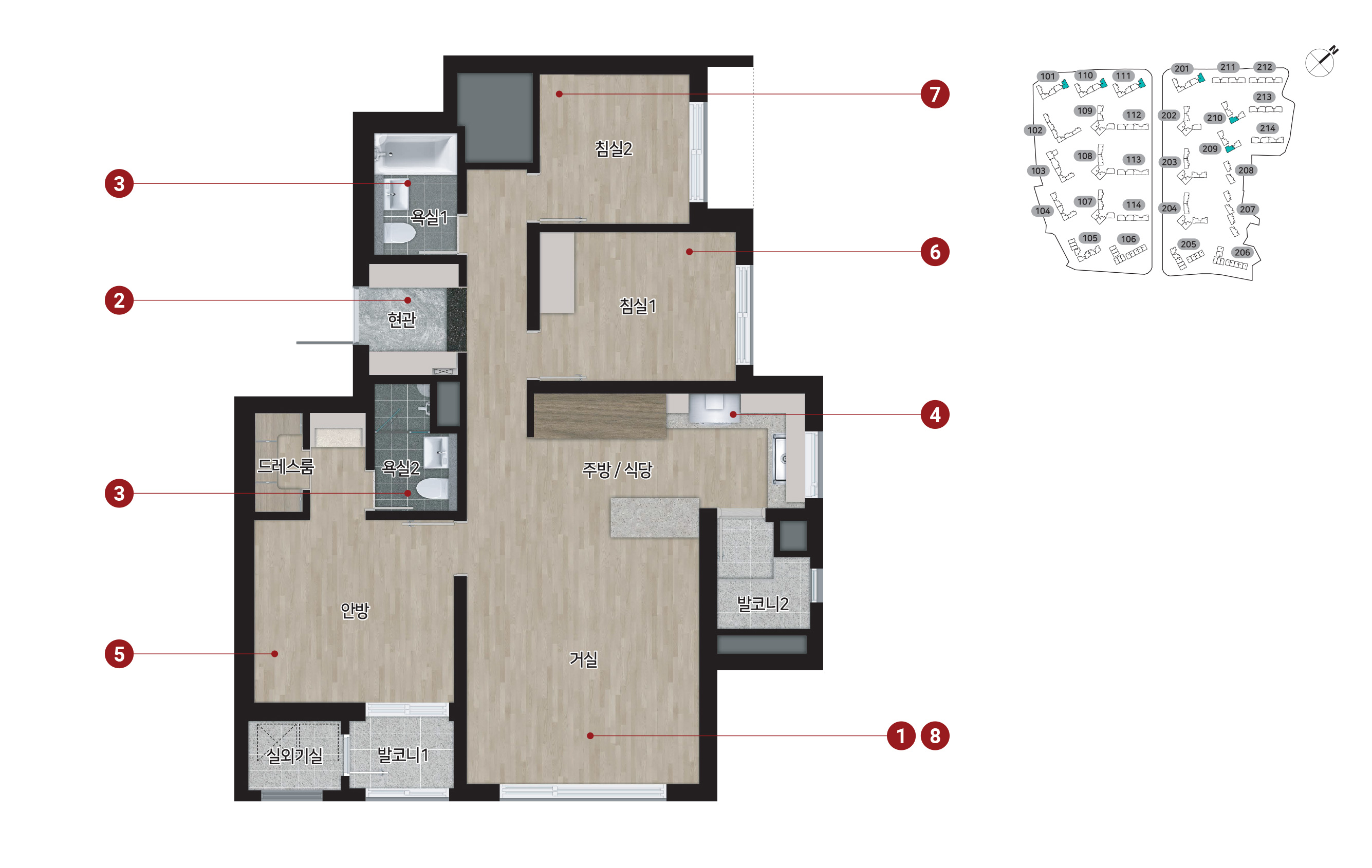 잔여 물량은 전용 74㎡ 중심으로 3베이 판상형과 탑상형이 공존합니다. 맞통풍이 가능한 구조, 드레스룸과 팬트리, 현관 수납을 반영해 체감 면적을 키웠습니다. 힐스테이트 메디알레는 세대별 전용 창고도 제공되어 계절가전과 레저용품 보관이 수월합니다.