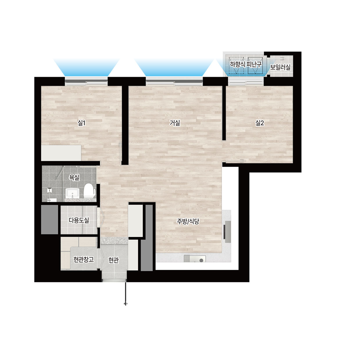 주력 면적은 59, 77, 84제곱미터로, 실수요가 두터운 중소형 구간을 집중 공략했습니다. 84형은 4베이 판상형 중심의 평면을 통해 거실 전면 폭과 채광을 확보했고, 대면형 주방과 다용도실 직결 가사 동선으로 체류 시간을 효율화했습니다. 현관 창고, 팬트리, 드레스룸을 적재적소에 배치해 수납 압력을 낮췄고, 일부 타입은 가변 벽체를 적용해 생애주기 변화에 따른 공간 전환이 수월합니다. 59형은 발코니 확장 시 체감 거실 폭이 커져 30평대 구축을 대체하려는 수요에도 대응합니다. 마감과 설비는 거실·주방의 개방감을 살리는 창호 비례, 건식과 습식의 명확한 욕실 분리, 무인 택배와 원패스 출입 등 생활 디테일에 힘을 준 구성이 눈에 띕니다.