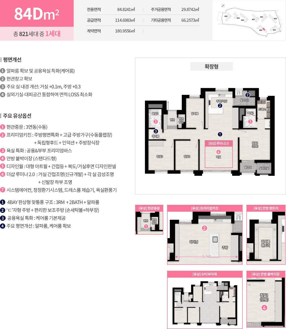 선호도 높은 중소형 라인업이 중심입니다. 전용 59㎡는 2면 개방형 구조로 거실과 주방의 거리감을 줄여 실사용 면적 체감을 키웠고, ㄷ자형 주방과 넓은 거실 폭이 핵심 포인트입니다. 전용 73㎡는 정석 4Bay 판상형으로 맞통풍과 채광이 탁월하며 현관 창고와 팬트리, ㄱ자형 드레스룸을 더해 수납 동선을 깔끔히 정리했습니다. 전용 84㎡는 3룸에 알파룸을 더해 서재나 취미실, 키즈룸까지 다양한 변주가 가능하고, 보조주방과 케어룸 특화로 생활 디테일까지 챙겼습니다. 일부 84㎡C는 사선형 거실 동선으로 공간 확장감과 프라이버시를 동시에 확보했습니다. 더샵 당리 센트리체가 중소형 중심임에도 확장성과 수납을 촘촘히 설계한 이유가 분명해집니다.