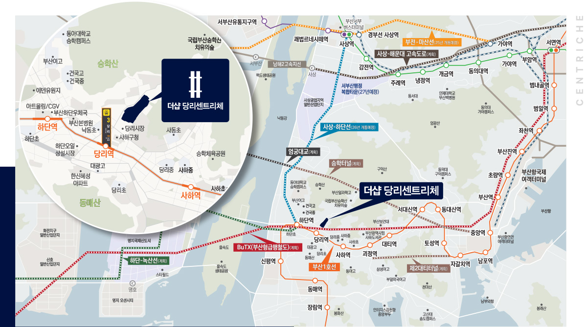 더샵 당리 센트리체는 부산지하철 1호선 당리역 초역세권 입지로 출퇴근과 통학, 생활 동선이 단순합니다. 사상하단선과 하단녹산선 등 서부권 도시철도망 확대 계획이 진행되며, 부산형급행철도 BuTX 계획도 더해져 환승 거점 개발이 기대됩니다. 자차 이동은 사하대로, 장평로, 낙동남로 등 간선 도로망과 천마터널, 장평지하차도, 대티터널, 을숙도대교 등 터널 교량축을 통해 시내외 접근이 수월합니다. 교통은 실거주 만족과 시세 방어력에 직결되는 만큼 더샵 당리 센트리체의 강점입니다.
