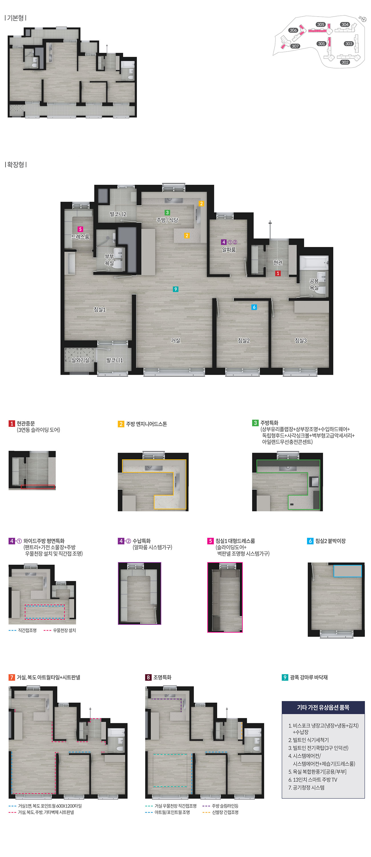 문산역 동문3차 디이스트는 전용 59에서 84 제곱미터까지 중소형 위주로 구성됩니다. 실수요층이 많은 59A는 침실 3, 욕실 2, 4베이 구조로 맞통풍과 채광이 뛰어나고, 알파 수납을 고려한 팬트리와 드레스룸이 강점입니다. 타입별로 제공되는 서비스 면적은 유연한 취미·수납 존을 만드는 데 유용합니다. 발코니 확장 시 일부 타입에서 드레스룸, 화장대, 주방 TV, 광파오븐 등 무상 품목을 제공해 초기 부담을 낮추는 전략도 눈에 띕니다. 84 타입은 거실 폭과 주방 동선을 넓혀 3~4인 가구의 생활 리듬을 정돈하기 좋습니다. 실사용성에 집중한 이 평면 전략은 문산역 동문3차 디이스트의 체감 만족도를 끌어올립니다.