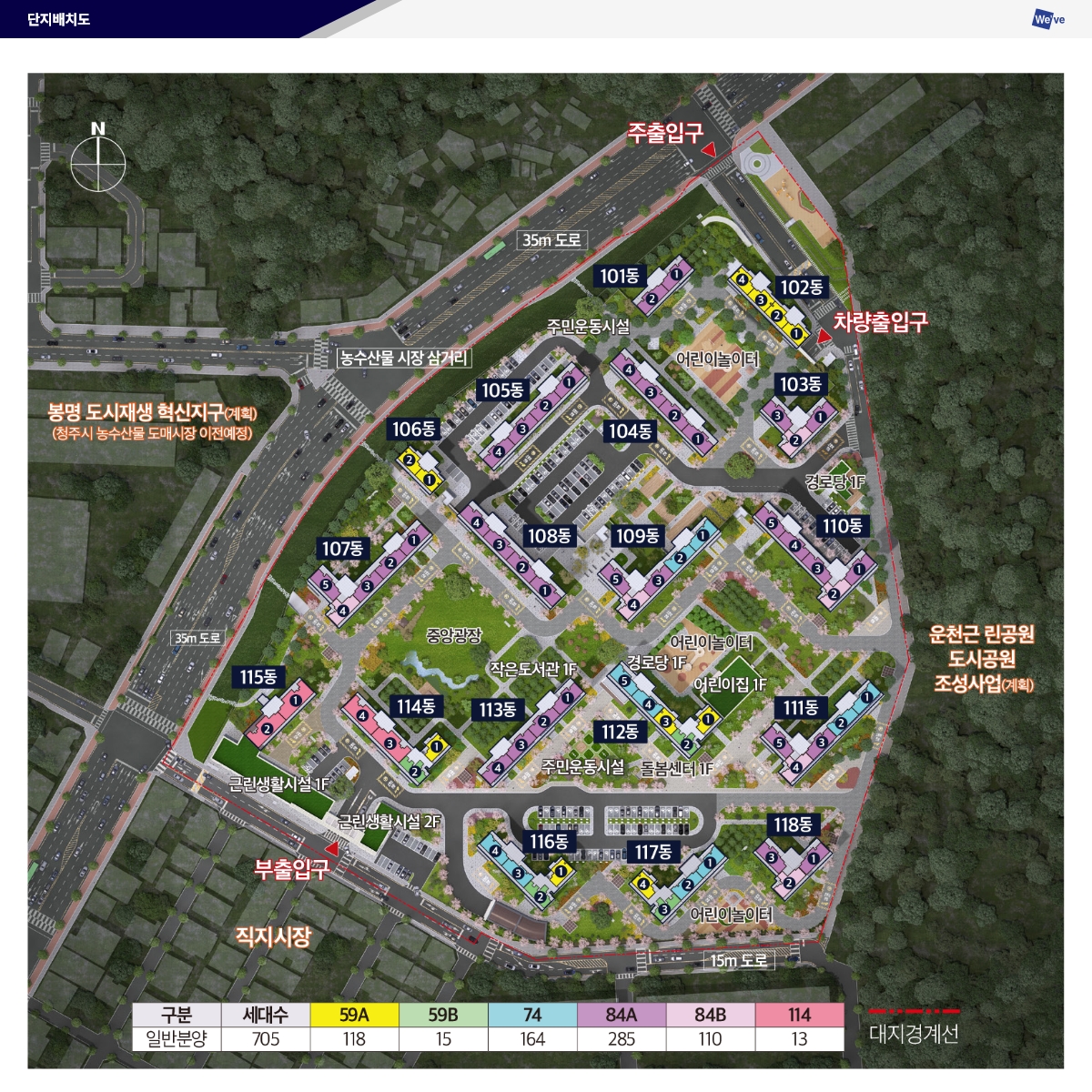 두산위브더제니스 청주 센트럴파크는 지하 2층부터 지상 31층, 18개 동, 총 1618세대로 계획되었으며 이 중 705세대가 일반분양 예정입니다. 대단지 규모는 관리 효율과 커뮤니티 다양성, 단지 내 조경 완성도를 동시에 끌어올립니다. 남향 위주의 배치와 동간거리 확보로 일조와 사생활 보호를 고려했고, 지상 보행 안전을 강화한 공원형 단지 구성이 예상됩니다.