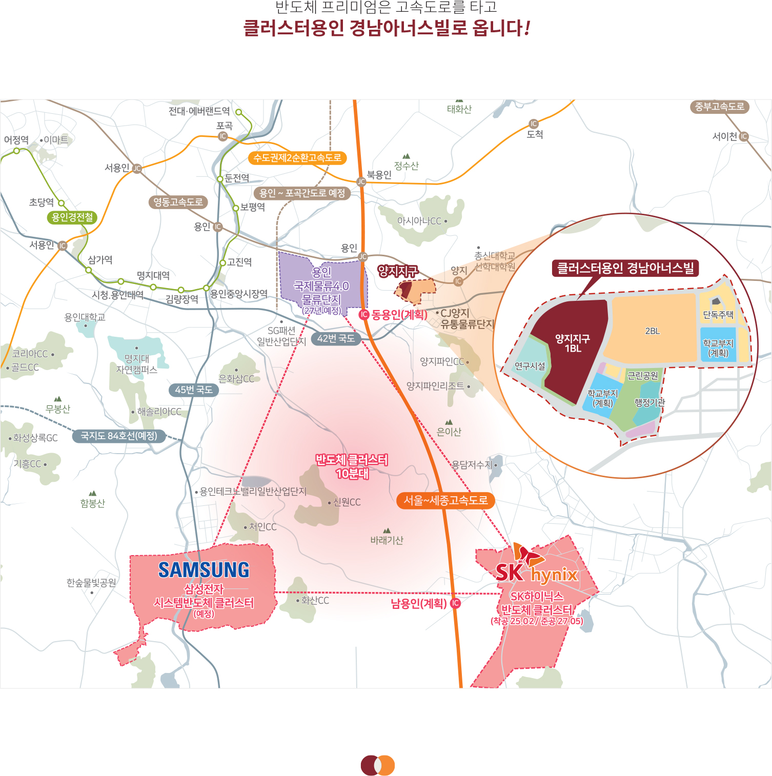 서울세종고속도로, 영동고속도로 접근성이 뛰어나고, 계획 중인 동용인IC가 개통되면 제2경부고속도로 이용 편의가 커질 전망입니다. 중부대로를 통한 처인구 중심 생활권 접근도 간편합니다. 남측 양지면 상업지구의 마켓·학원가·병원·공원은 이미 갖춰져 있어 입주 초기 생활 공백이 적을 것으로 보입니다. 교육은 양지초·용동중을 비롯해 추가 학교 2곳이 예정돼 도보 통학 여건이 좋습니다. 직장 접근성은 국제물류센터, SK하이닉스(약 8km), 그리고 인근 삼성전자 등 반도체 산단과의 근접성이 핵심 포인트로, 10분대 출퇴근 수요를 흡수할 가능성이 큽니다. 결국 클러스터용인 경남아너스빌의 핵심은 ‘가까움’입니다.