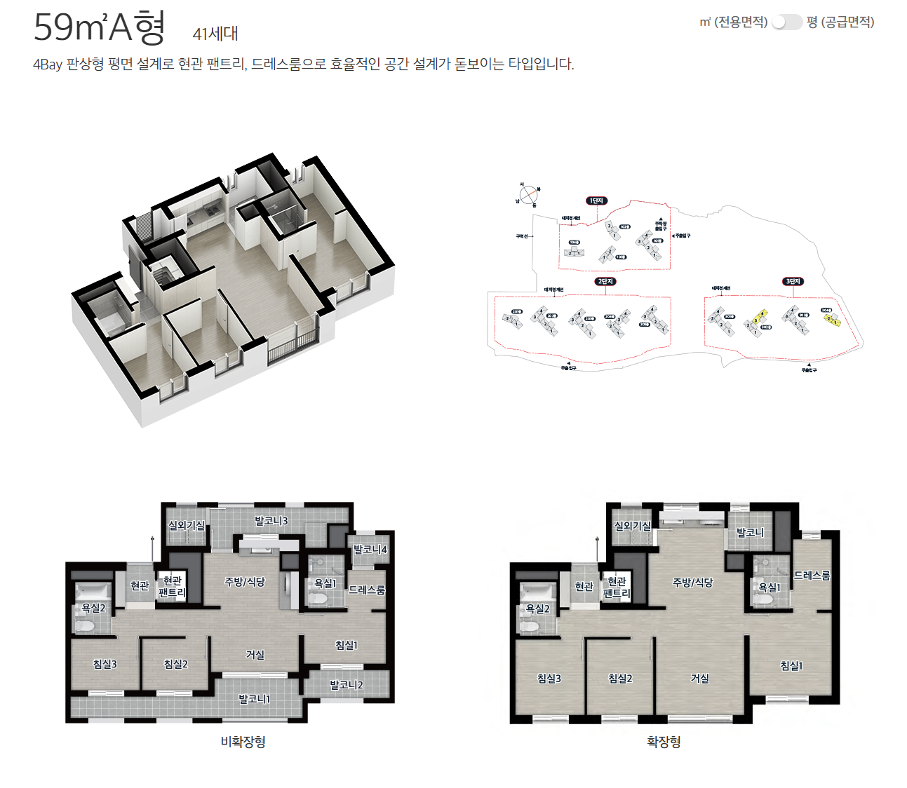 전용 59㎡·84㎡의 중소형으로만 구성했고 두 타입 모두 4베이 판상형입니다. 특히 84A는 맞통풍이 가능한 동선, 드레스룸·현관 팬트리·연결형 다이닝으로 가사 효율이 높습니다. 태양광 발전, 실별 온도 제어, 전열교환 환기, 홈 IoT로 마감한 스마트 설계는 실거주 만족도를 끌어올립니다. 소형이라도 수납과 환기, 동선에서 불편을 줄이는 설계가 일산 이편한세상 메이포레 의 경쟁력입니다.
