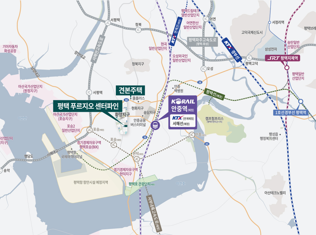 화양지구는 서해선·평택선·KTX 연계가 단계적으로 추진되는 권역으로, 안중역이 생활권 중심에 있습니다. 복선전철 확장과 광역 노선 연계가 이뤄지면 서울권 환승 동선이 단순해질 전망입니다. 도로는 서해안고속도로(포승IC), 38·39번 국도, 평택파주고속도로 축을 통해 수도권·충청권 접근성이 좋습니다. 이런 입지 축의 확장은 평택 푸르지오 센터파인의 출퇴근 시간비용을 줄여주는 실질 가치입니다.