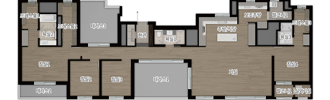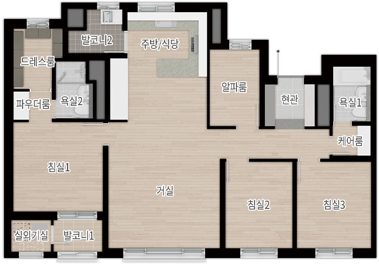 실수요가 가장 선호하는 중형(전용 84㎡)을 주력으로 115㎡, 펜트하우스(134㎡ 이상)까지 준비해 선택 폭을 넓혔습니다. 더샵 광양레이크센텀의 84㎡ A~C는 4Bay 판상형에 맞통풍이 가능한 구조라 채광·환기 효율이 뛰어나고, 알파룸을 서재·취미실로 활용하기 좋습니다. ㄷ자 주방과 창 있는 드레스룸을 채용해 수납과 습기 관리가 수월합니다. 84㎡ D는 2Bay 타워형으로 LDK 일체형 거실이 주는 개방감이 돋보이며, ㄱ자 주방과 다용도실의 짧은 동선 덕분에 가사 효율이 높습니다. 더샵 광양레이크센텀은 타입별로 현관 수납, 팬트리, 알파룸을 세심하게 배치해 ‘수납이 넉넉한 집’을 찾는 수요에게 분명한 대안을 제시합니다.