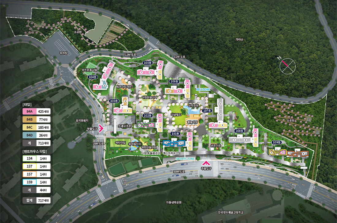 뒤로 가야산, 앞으로 마동호수·생태공원이 펼쳐지는 입지에 걸맞게, 지상은 공원형으로 구성했습니다. 주동은 남향 위주, 최장 148m 동간 이격으로 통경축과 채광을 확보했습니다. 더샵 광양레이크센텀에는 물놀이장, 산수정원, 좌우 소공원, 선큰 가든이 이어져 단지 안에서도 산책·휴식 동선이 완성됩니다. 스포츠존(피트니스·필라테스·사우나·탁구장)과 스크린 골프연습장, 북카페·스터디룸·프라이빗 독서공간을 갖춘 에듀존, 가족이나 지인을 초대하기 좋은 게스트하우스까지, 주말에 굳이 멀리 나가지 않아도 되는 생활 편의를 누릴 수 있습니다. 이처럼 더샵 광양레이크센텀은 ‘집 안팎이 모두 여가 공간’인 구성을 지향합니다.