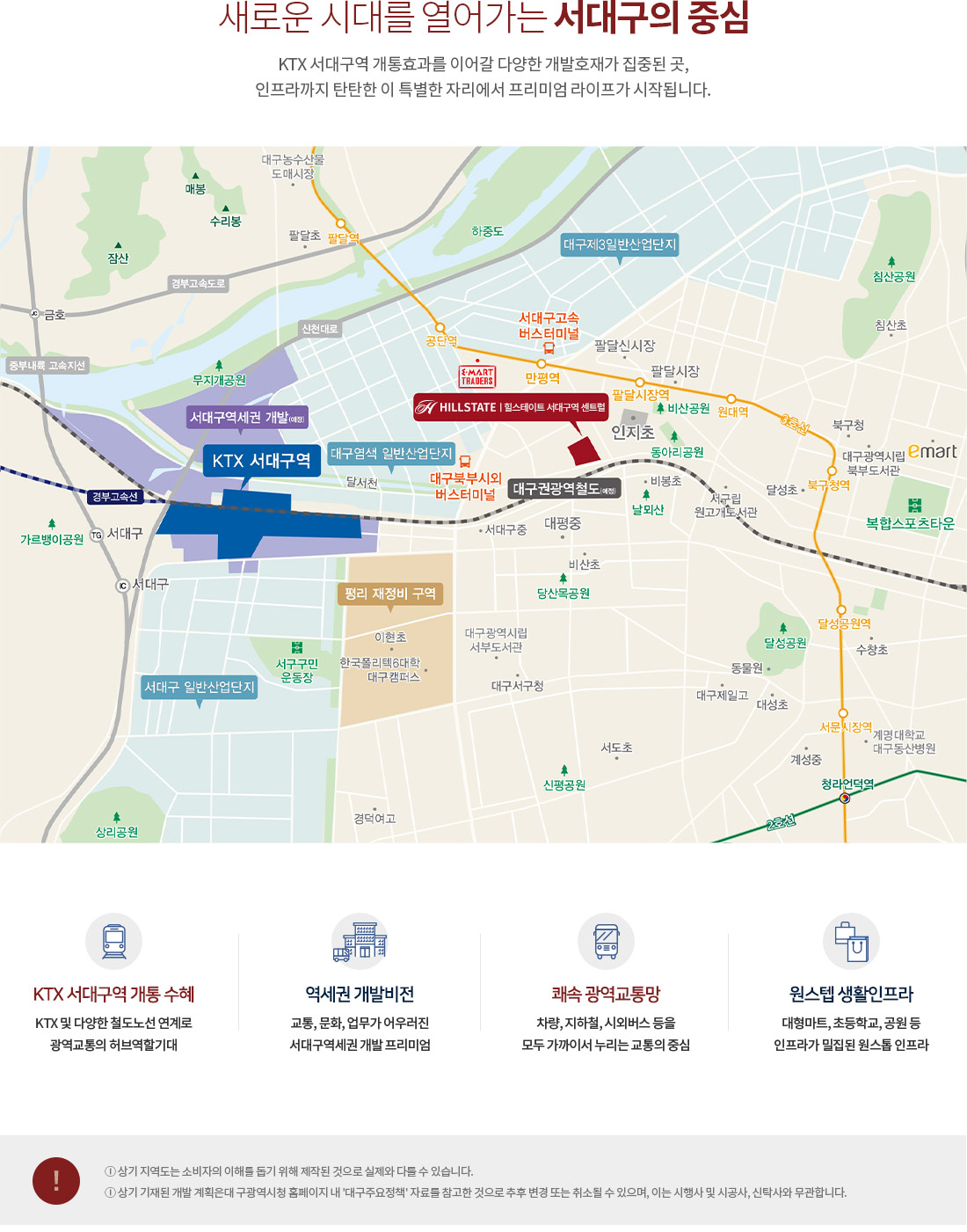 도보권에 도시철도 3호선(만평·팔달시장역)이 있고, KTX 서대구역 접근성으로 광역 이동이 수월합니다. 역세권 복합환승, 배후 상권 정비, 주거타운 조성 계획이 순차적으로 이어지고 있어, 교통과 상업의 집적이 가져오는 시세 방어력도 기대할 만합니다. 힐스테이트 서대구역 센트럴이 ‘지금의 편의’와 ‘내일의 확장성’을 동시에 품었다는 뜻입니다.
