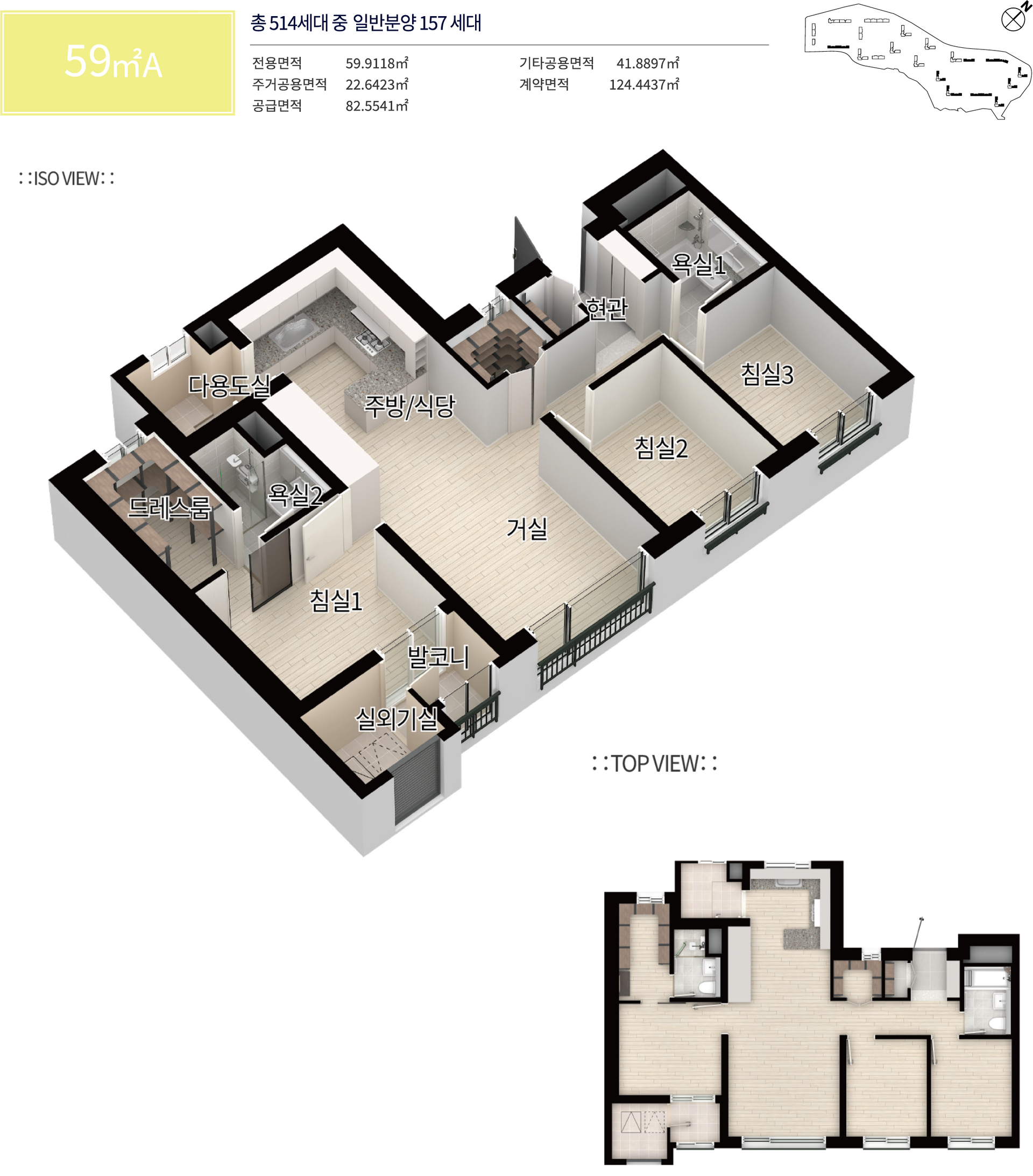 전용 59~85㎡로 실수요 선호가 높은 중소형 위주 라인업입니다. 판상형 4베이 중심의 맞통풍 설계가 기본이라 채광과 환기 효율이 좋고, 타입별로 알파룸과 팬트리를 특화해 수납 스트레스를 줄였습니다. A타입은 ㄷ자 주방과 대형 팬트리가 강점이고, B타입은 타워형에 ㄴ자 주방 구성이어도 수납을 넉넉히 확보해 취향에 따라 고르기 좋습니다. 실제로 두산위브 센트럴파크 강화는 “작아도 넓게 쓰는” 체감면적 설계가 돋보입니다.