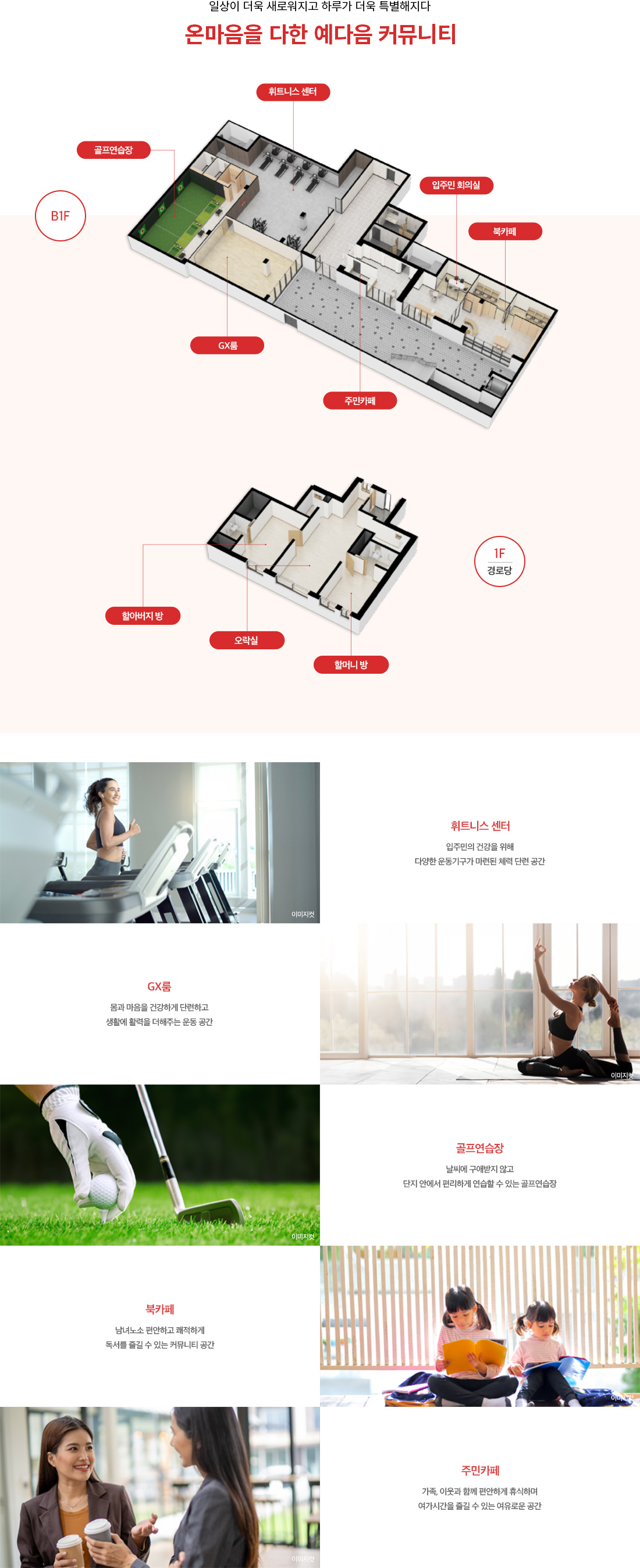 규모 대비 알찬 커뮤니티 구성이 돋보입니다. 피트니스와 GX룸, 실내 골프연습장, 입주민 카페, 회의실, 북카페, 독서실, 경로당까지 전 연령대를 아우릅니다. 비 오는 날에도 운동과 학습, 소통이 단지 안에서 해결되는 구조라 주말 체류 시간이 길어지는 것이 장점입니다. 이 실내 생활 네트워크는 안성 아양지구 영무예다음의 체감 프리미엄을 만드는 부분입니다.