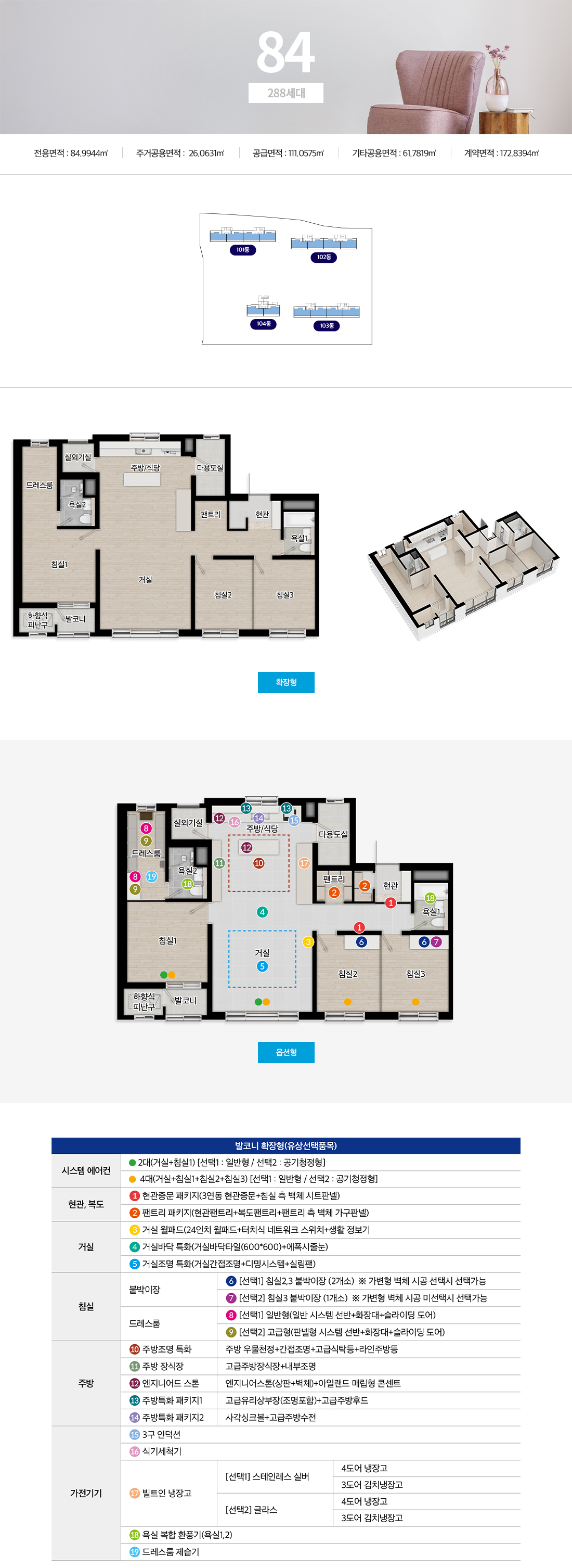 공급은 전 세대 전용 84㎡ 단일 타입입니다. 전 호실 4베이 판상형으로 채광과 환기에 유리하고, 거실과 주방의 대면형 배치로 가족 동선이 자연스럽습니다. 3개의 침실과 2개의 욕실, 파우더장 포함 드레스룸은 창호가 있어 환기가 쉽습니다. 일자형 주방 양옆으로 발코니를 두어 보조 주방과 수납을 유연하게 쓰도록 했고, 현관과 복도 팬트리로 계절용품도 깔끔히 정리됩니다. 실사용 면적 체감이 좋아 안성 아양지구 영무예다음의 실거주 만족을 높이는 핵심 요소입니다.