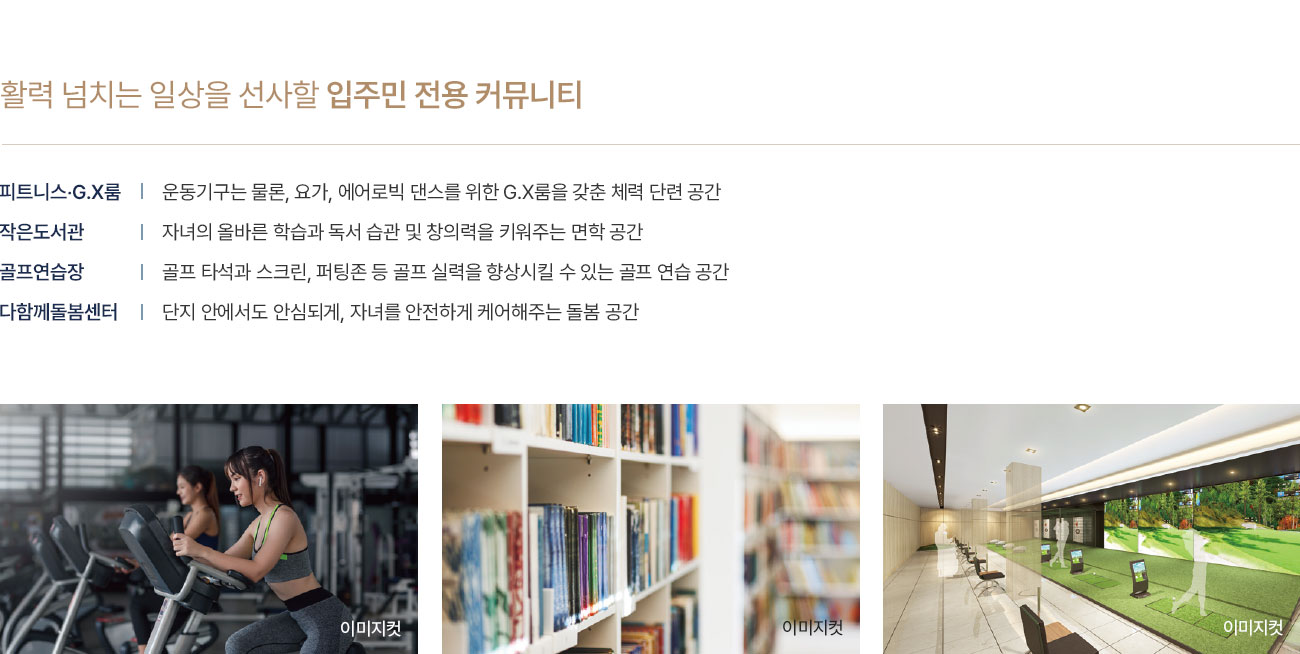 보행 중심의 동선 위에 생활 편의와 취미, 학습 기능을 골고루 얹었습니다. 실내에는 피트니스와 GX룸, 샤워실로 이어지는 운동 라인업, 골프타석과 스크린, 퍼팅존을 갖춘 골프연습장, 작은도서관과 스터디룸, 주민회의실이 들어섭니다. 다함께돌봄센터를 통해 돌봄 공백을 줄일 수 있고, 무인택배를 포함한 기본 보안 설비로 일상의 안정감을 높입니다. 단지 외부는 완급이 다른 산책 동선을 품어 아이부터 어른까지 머무는 시간이 자연스럽게 늘어납니다. 이렇게 문산역 동문3차 디이스트의 커뮤니티는 집 안과 밖의 경계를 부드럽게 잇습니다.