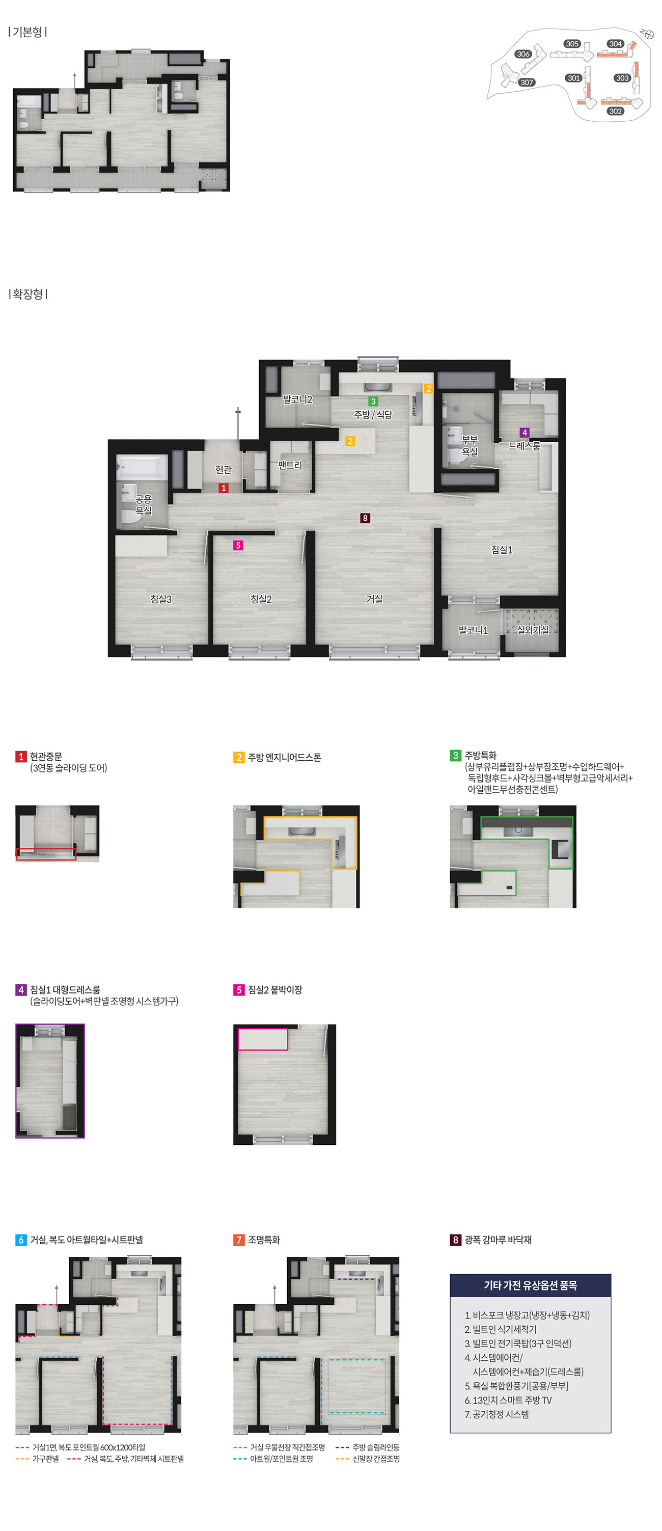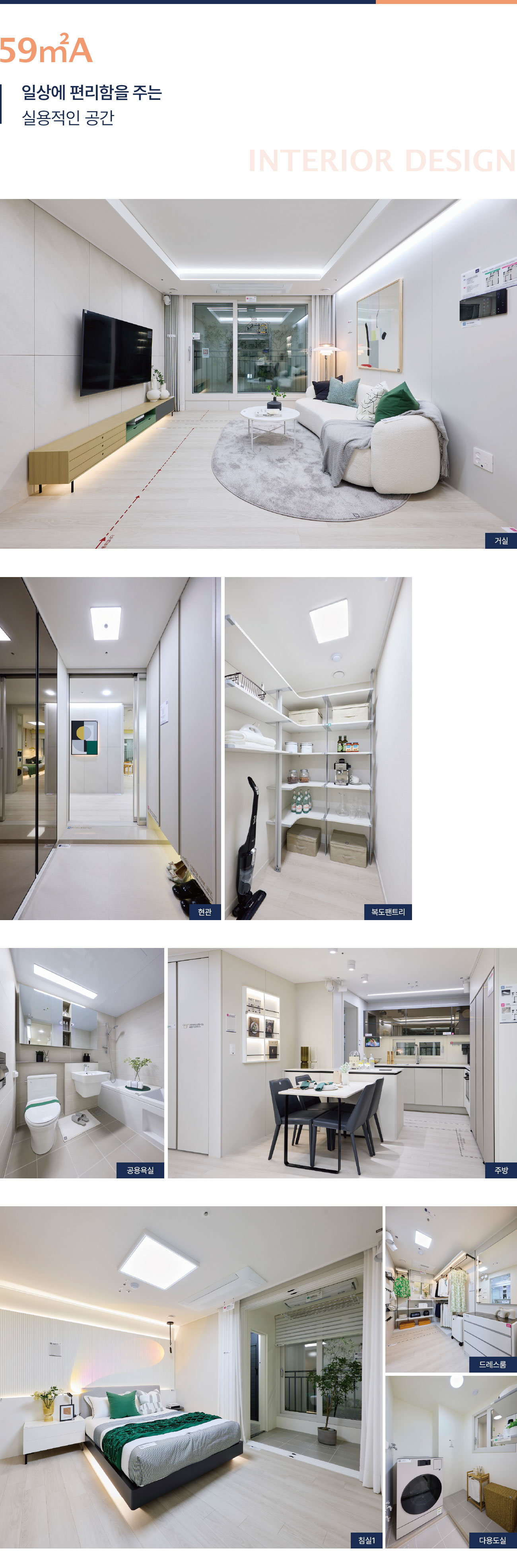 문산역 동문3차 디이스트는 전용 59에서 84 제곱미터까지 중소형 위주로 구성됩니다. 실수요층이 많은 59A는 침실 3, 욕실 2, 4베이 구조로 맞통풍과 채광이 뛰어나고, 알파 수납을 고려한 팬트리와 드레스룸이 강점입니다. 타입별로 제공되는 서비스 면적은 유연한 취미·수납 존을 만드는 데 유용합니다. 발코니 확장 시 일부 타입에서 드레스룸, 화장대, 주방 TV, 광파오븐 등 무상 품목을 제공해 초기 부담을 낮추는 전략도 눈에 띕니다. 84 타입은 거실 폭과 주방 동선을 넓혀 3~4인 가구의 생활 리듬을 정돈하기 좋습니다. 실사용성에 집중한 이 평면 전략은 문산역 동문3차 디이스트의 체감 만족도를 끌어올립니다.