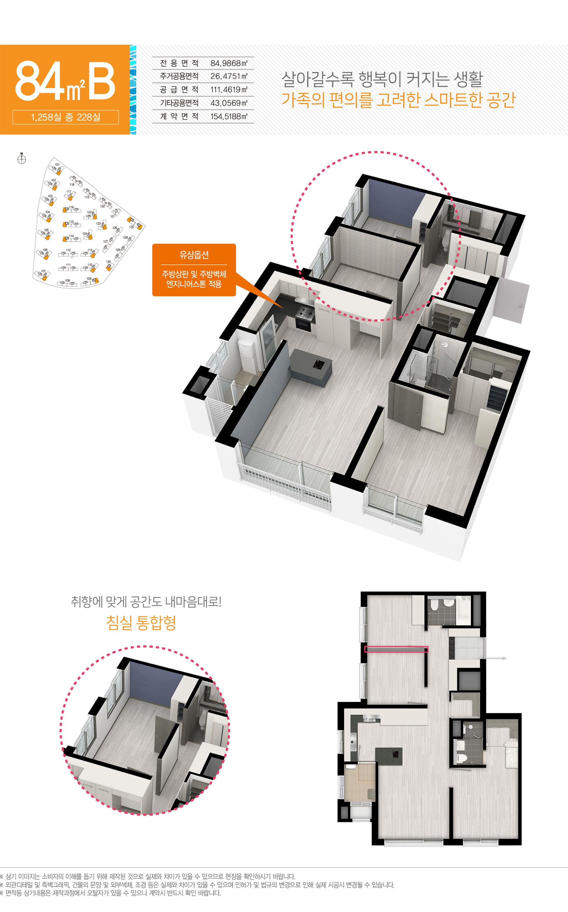 84A: 4Bay 판상·전면 채광·맞통풍·팬트리·드레스룸·알파룸. 가족 성장에 따라 방/수납 가변이 쉬움.