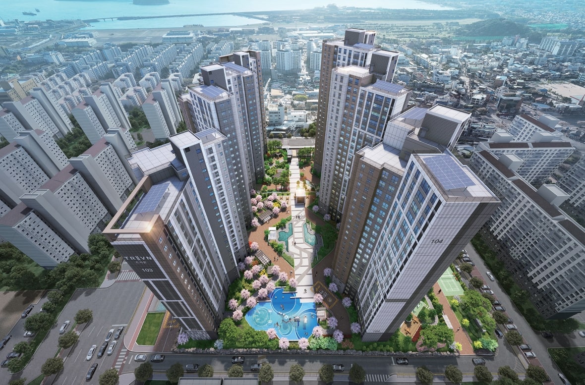 지하 커뮤니티에는 피트니스, GX룸, 골프연습장, 락커룸을, 지상에는 도서관형 라운지와 멀티룸, 클라이밍존을 배치했습니다. 어린이 놀이터와 물놀이장이 중앙 녹지축과 연결되어 있어 집 앞에서 안전하게 뛰놀 수 있고, 어른들은 수경 공간과 그늘 쉼터에서 휴식 루틴을 만들 수 있습니다. 주차와 보행을 분리하고 드롭오프와 맘스스테이션을 분산 배치한 점도 눈에 띕니다.